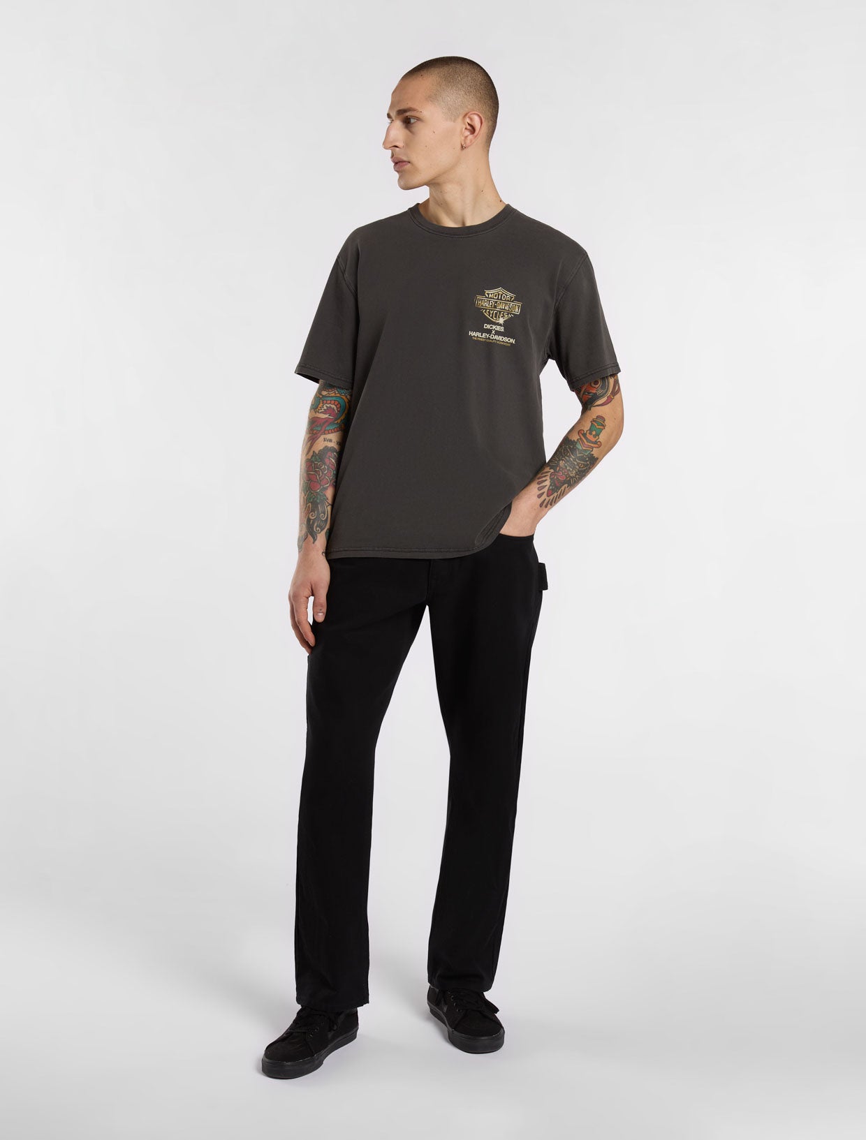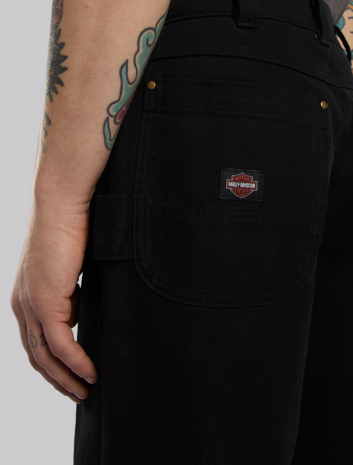 The exclusive Dickies x Harley-Davidson collection brings together the resilient spirit of two American makers, offering one-of-a-kind style steeped in rich moto history and legendary workwear for people who show up, work hard and earn their leisure time on the open road. Designed with a work-inspired aesthetic, these relaxed-fit carpenter trousers are engineered with multiple pockets – including a wallet pocket inside the front scoop pocket, a roomy utility pocket on the left leg and a dual-entry zipped pocket on the back. They also come with a D-ring on the back waistband where you can clip keys to keep them out of the way.