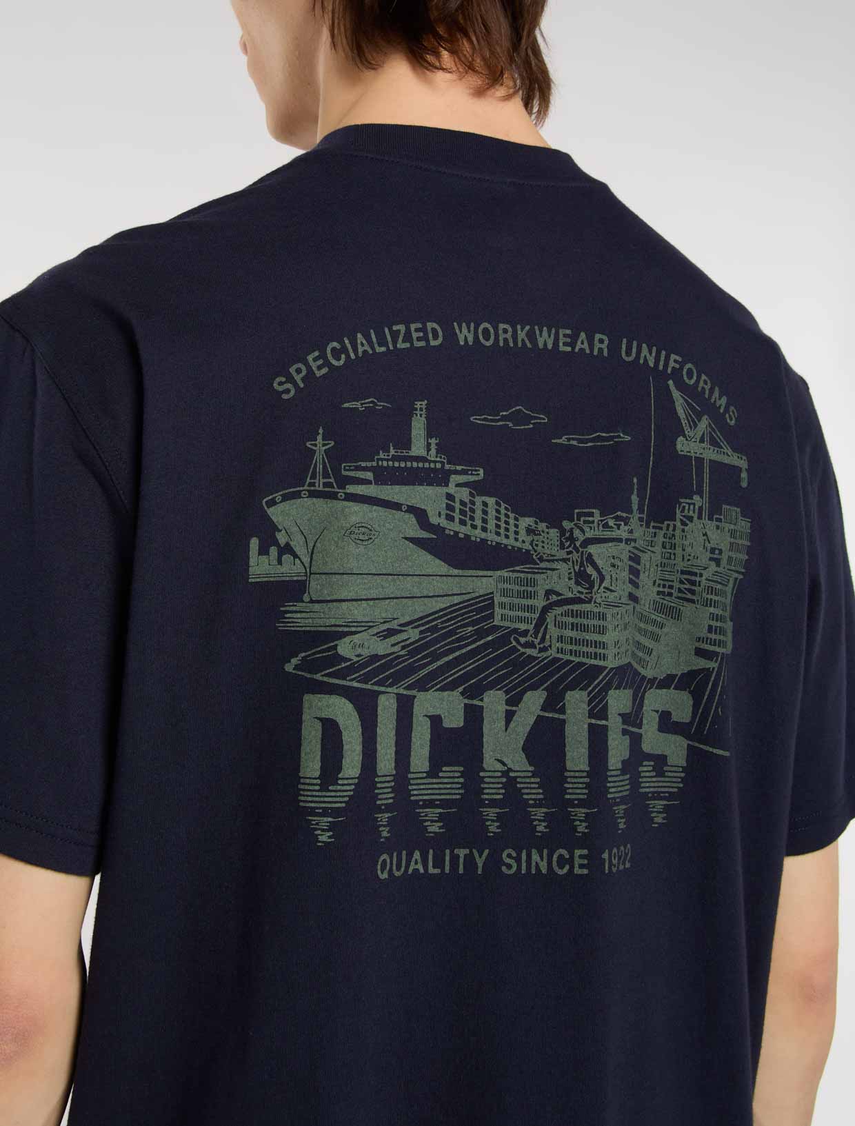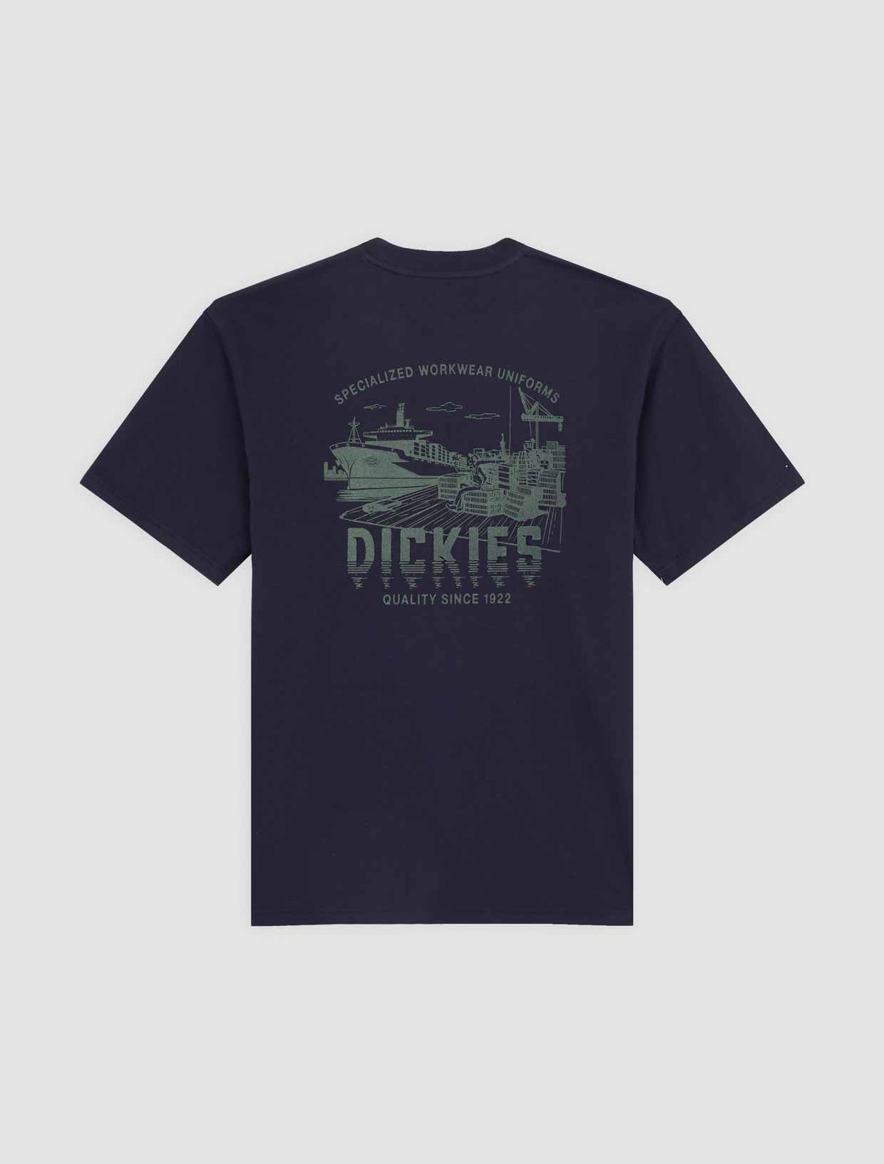 Featuring a large printed graphic on the back that captures the rugged, hardworking essence of harbour life, the Pelham is a short sleeve t-shirt finished with a Dickies woven hem loop label.