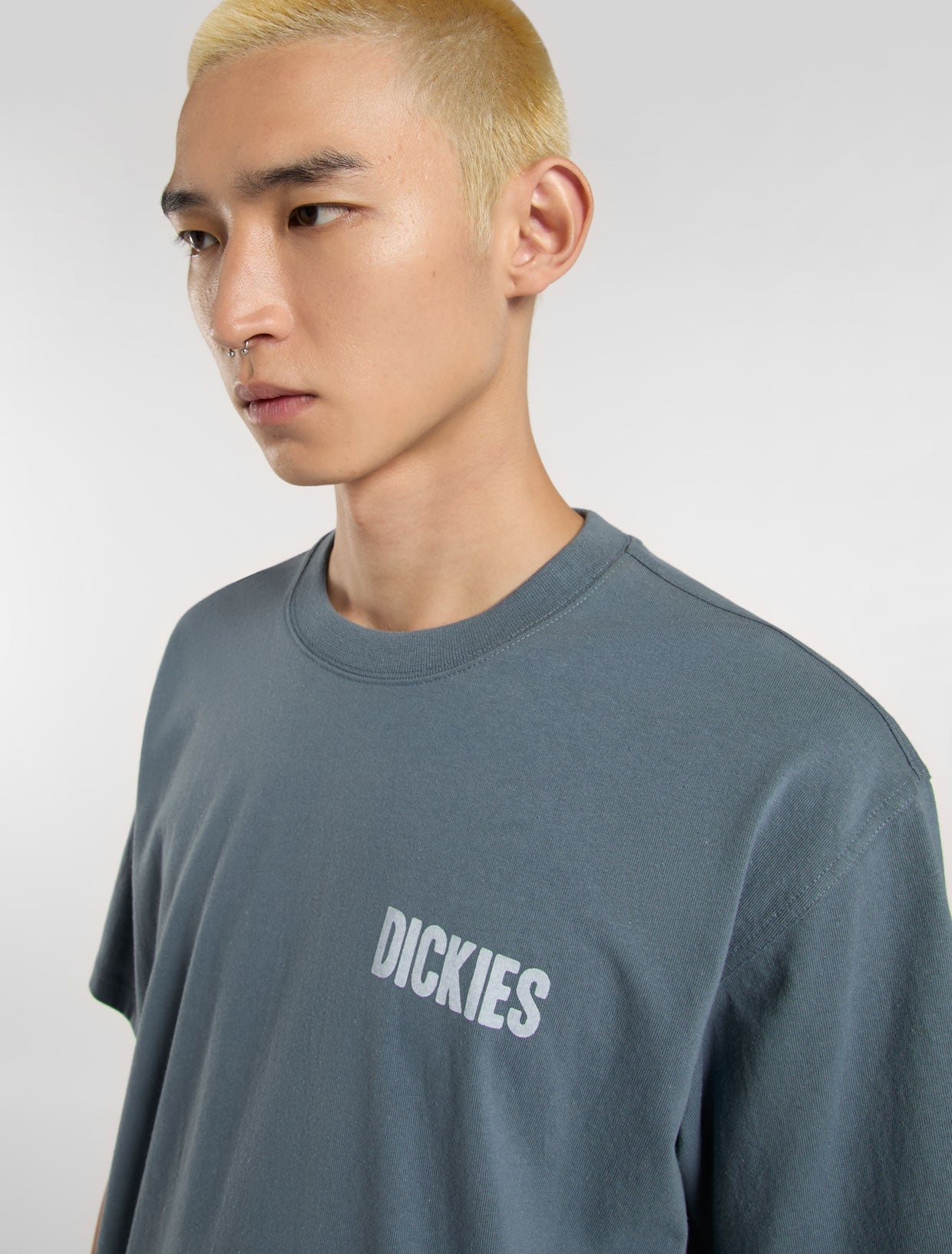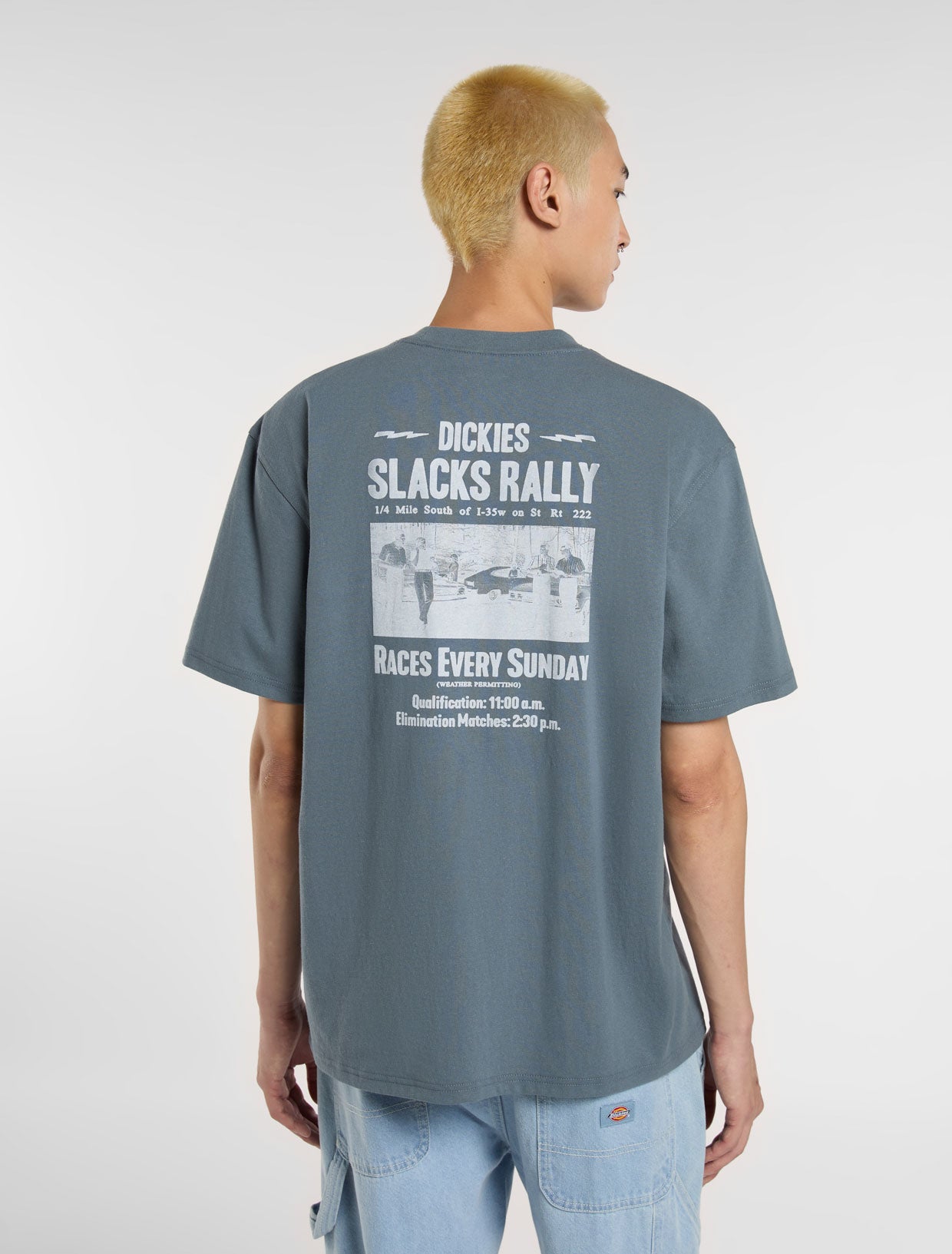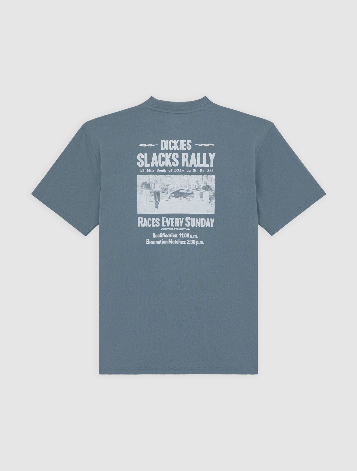 The Slacks Rally T-Shirt is a relaxed graphic t-shirt crafted with vintage-inspired artwork that pays tribute to our workwear heritage. Made from sturdy cotton, this short-sleeve tee features the iconic Dickies logo on the chest alongside a large vintage-style rally poster graphic on the back.